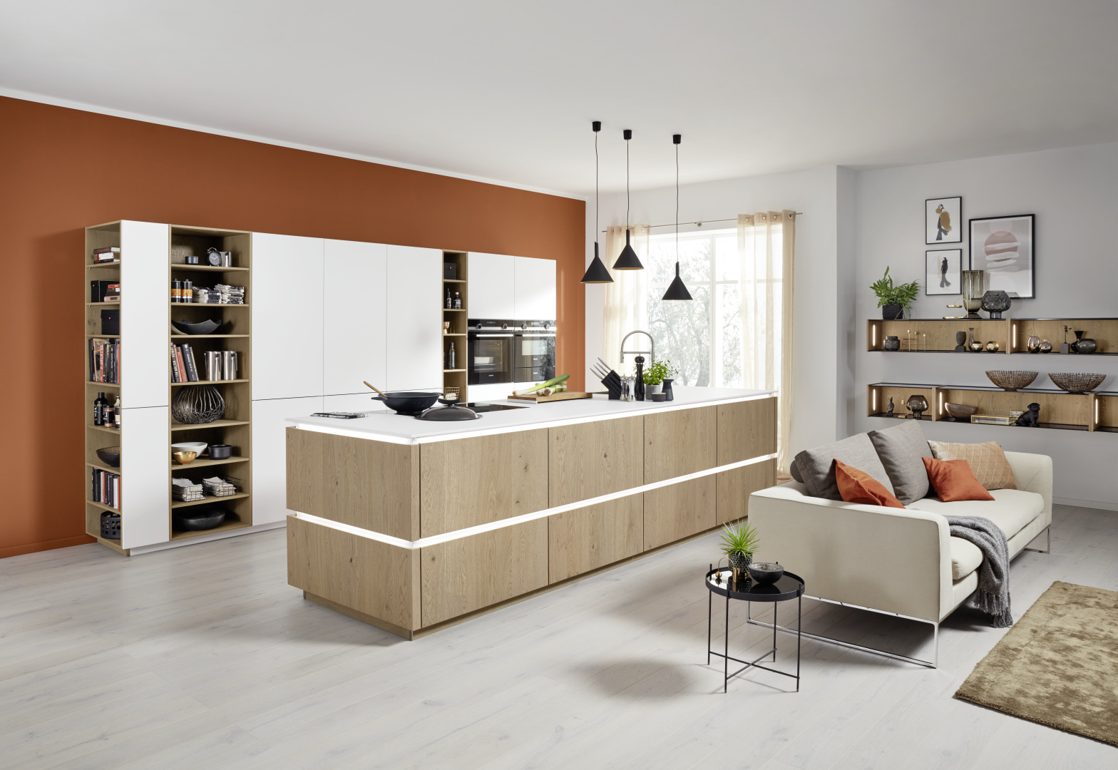 Кухня — это часть жилого пространства, поэтому фабрика Nolte Küchen предлагает различные решения плавного перехода из кухонной зоны в жилую. Чёрные стеклянные открытые полки и варианты встроенного освещения помогают наполнить помещение теплой домашней атмосферой.