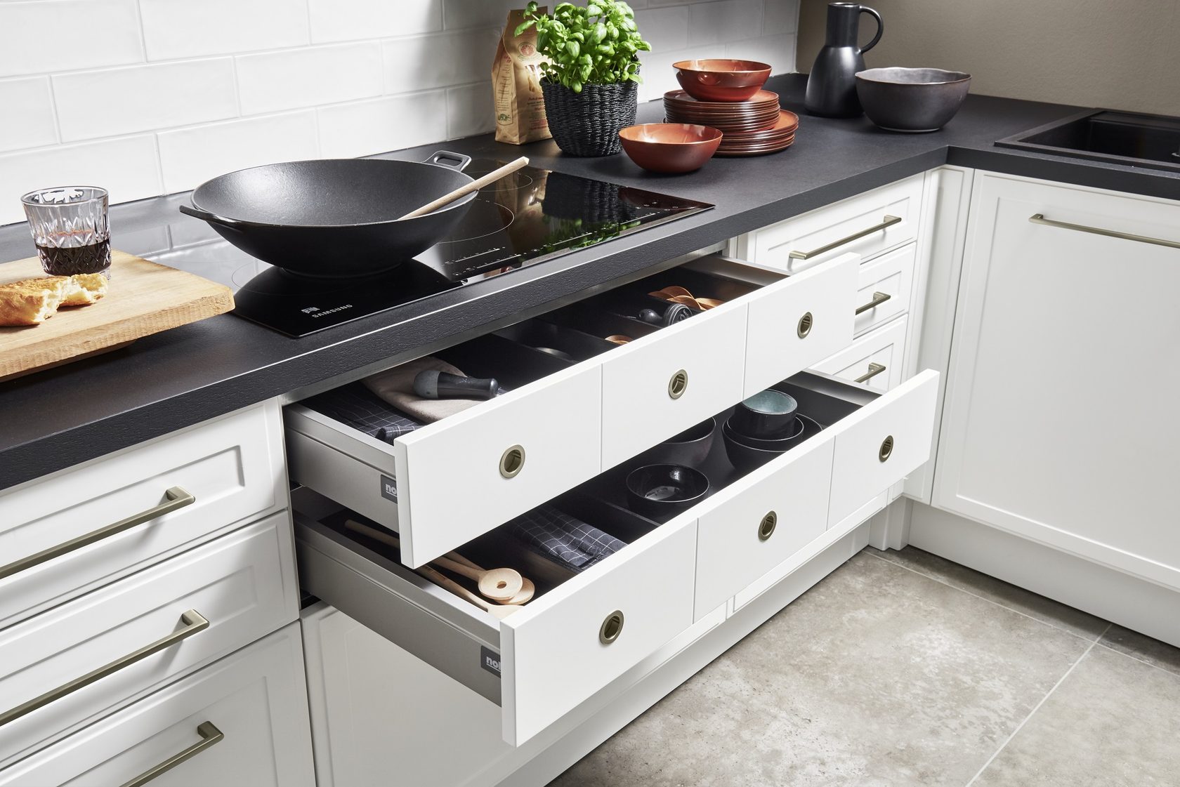 Стиль New Classic неразрывно связан с гармоничным сочетанием контрастных элементов. Кроме уже перечисленного разнообразия цветов и тёплого бронзового оттенка Manganese Bronze в данной коллекции присутствует ещё и текстура дерева. Описанные выше выдвижные ящики могут быть выполнены в оттенках дуба Oak Pinot или Oak Barolo. Кроме того, в том же декоре можно оформить открытые элементы в виде перекрёстных вставок. Особого внимания заслуживают выдвижные ящики из массива дерева. Выполненные в минималистическом стиле без ручек такие ящики служат элегантным акцентом на фоне гладких матовых фасадов. Все размеры точно подобраны, так что единая горизонтальная линия не нарушена. Напротив, геометрия форм только усиливается за счёт необычных элементов. Продумано и внутреннее наполнение: эффектные ящики дополняют разделительные вкладыши для приборов в цвете Black Ash.